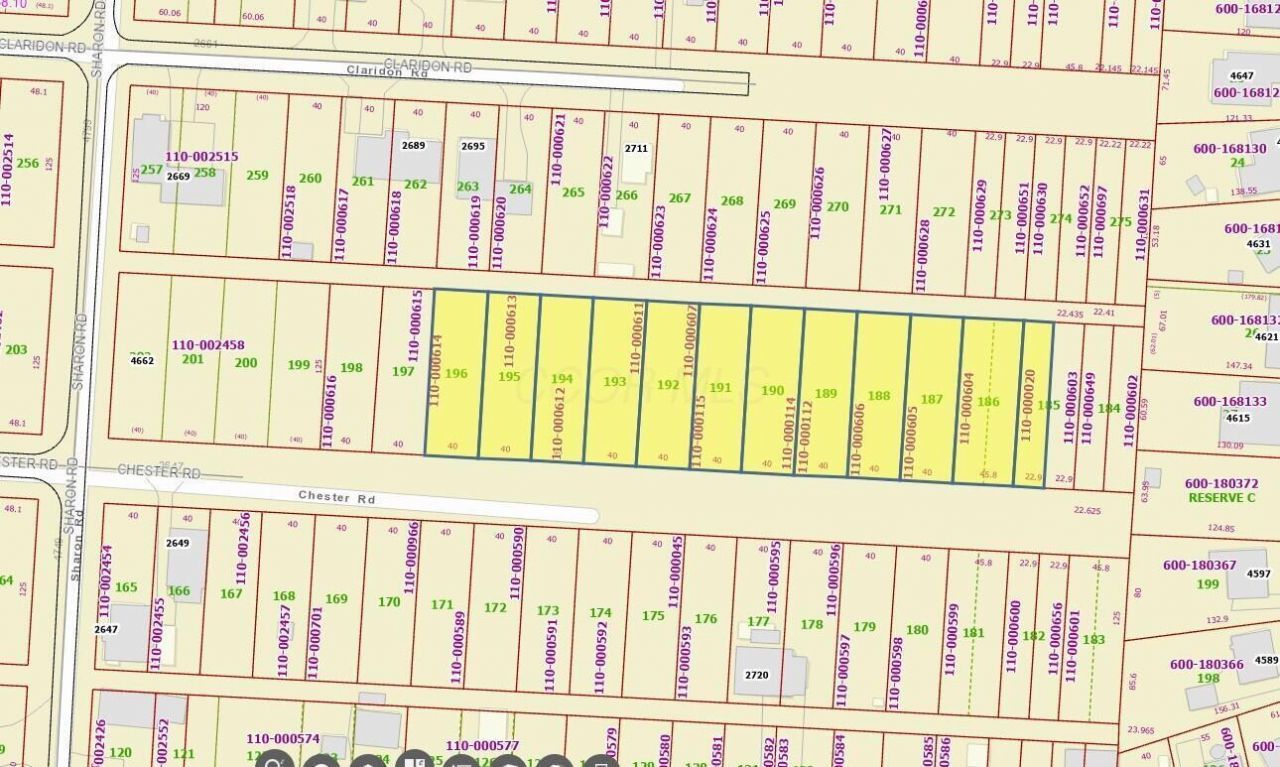 This listing includes 12 adjacent parcels; please reference Zoning documents for 60x125 site stipulations as well as other lot regulations. Parcel map in photos. Utilities such as gas, electric, and sewer are available and will need to be extended & verified. The current water source will be private well. There is no road access east of Sharon Road; a private road will need to be constructed. Additional parcels in this development are also availableâ??please check the MLS for more listings and details. This location provides convenient access to I-270, shopping, dining, and other local amenities.