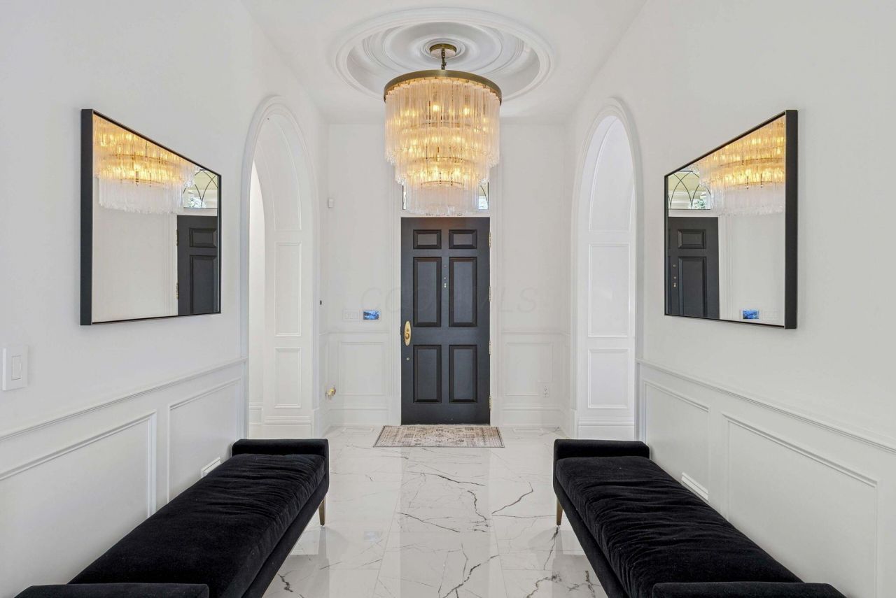 A triumph of architecture and artistry, 1 Bottomley Crescent, the first home on the iconic crescent within New Albany Country Club, seamlessly blends historic inspiration with modern luxury. Following a meticulous four year, whole home renovation, the residence has been reimagined with a refined modern aesthetic while preserving the timeless sophistication that defines every inch of the home. Intricate woodwork, soaring ceilings, and the warmth of multiple fireplaces create an atmosphere that is both grand and inviting. Every detail reflects thoughtful, tasteful execution, where classic elegance and contemporary comfort coexist in perfect harmony. Expansive windows fill the home with natural light while framing picturesque golf course views. The chef's kitchen is a true showpiece, featuring Gaggenau appliances, backlit quartzite countertops and backsplash, a custom wine refrigerator, and built-in espresso machine, designed for both daily living and elevated entertaining. Upstairs, the primary suite offers a private retreat with a sitting room and fireplace, along with a spa-inspired bath featuring a soaking tub and steam shower. Each additional bedroom includes its own ensuite, while a guest suite provides exceptional privacy and comfort. The lower level rivals a private club, complete with a 15 seat theater, fitness studio, full bath with steam shower, wine tasting room, and sports lounge with multiple screens. Whole house wired for theatre sound for TVs. The main-level lounge features beautiful wood paneled walls, a coffered ceiling, modern fireplace, illuminated built-ins, and Brazilian cherry flooring, creating a cinematic and timeless setting. Outdoor living includes a rooftop terrace with sweeping golf course views overlooking the front courtyard. Completing the home is a six-car garage with two lifts, 6 EV chargers, and a summer kitchen equipped with Viking appliances. Designed for exceptional entertaining and refined living.