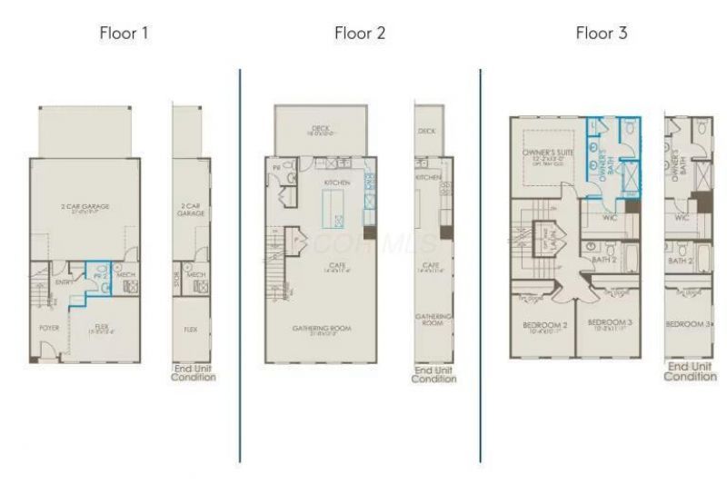 ESTIMATED COMPLETION BY THE END OF MAY. This is a stunning new 3 bed, 2 full and 2 half bath end unit condo in Towns on the Parkway. The 2nd floor kitchen has built in stainless KitchenAid gas appliances, new haven harbor cabinets, calacatta gold quartz counters, artcrafted coconut tile backsplash, a single bowl porcelain farm sink with a moen slign spring faucet, a huge island with space for seating, beautiful avery olde bronze clear glass cone pendant lighting and a pantry for storage. An eating space, great room, powder room and an amazing deck. The 3rd floor owners suite has a tray ceiling and a private bath with a double bowl vanity, miami white quartz counter, walk-in prime elect white tile shower, a linen closet, enclosed toilet area and a awesome walk-in closet. An add'l 2 beds, a full bath and laundry area. A 1st floor multi use flex space, powder room, drop zone and a 2 car garage. Luxury vinyl tile flooring throughout the first 2 levels. Bronze finishes and fixtures. Smart home features included. Gorgeous umber rail and wrought iron spindles. Upscale townhome living, walkable to bars, restaurants, the iconic Dublin Link Pedestrian Bridge (spanning the Scioto River, joining historic Dublin with Bridge Park) and so much more. Interior photos are of a model, not the actual home.