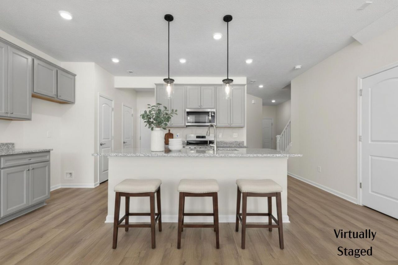 This newly constructed two-story townhome offers over 1,900 square feet of comfortable, well-planned living space. The home includes 3 bedrooms, 2.5 bathrooms, and a 2-car attached garage with a built-in boot bench at the interior entry, along with a conveniently located main-level powder room. The first floor features a bright and open layout with a welcoming family room and a kitchen designed for both function and style, complete with a center island, granite countertops, and stainless steel appliances. A heated sunroom extends the living space and provides access to the rear concrete patio, creating an ideal setting for everyday enjoyment or casual entertaining. Upstairs, the primary bedroom suite includes a walk-in shower, dual vanities with quartz counters and a walk-in closet. Two additional bedrooms, a full bathroom, and a second-floor laundry area complete the upper level. Additional features include upgraded carpet throughout, modern finishes, and the convenience of low-maintenance, new-construction living in a thoughtfully designed townhome setting. READY FOR MOVE IN NOW!